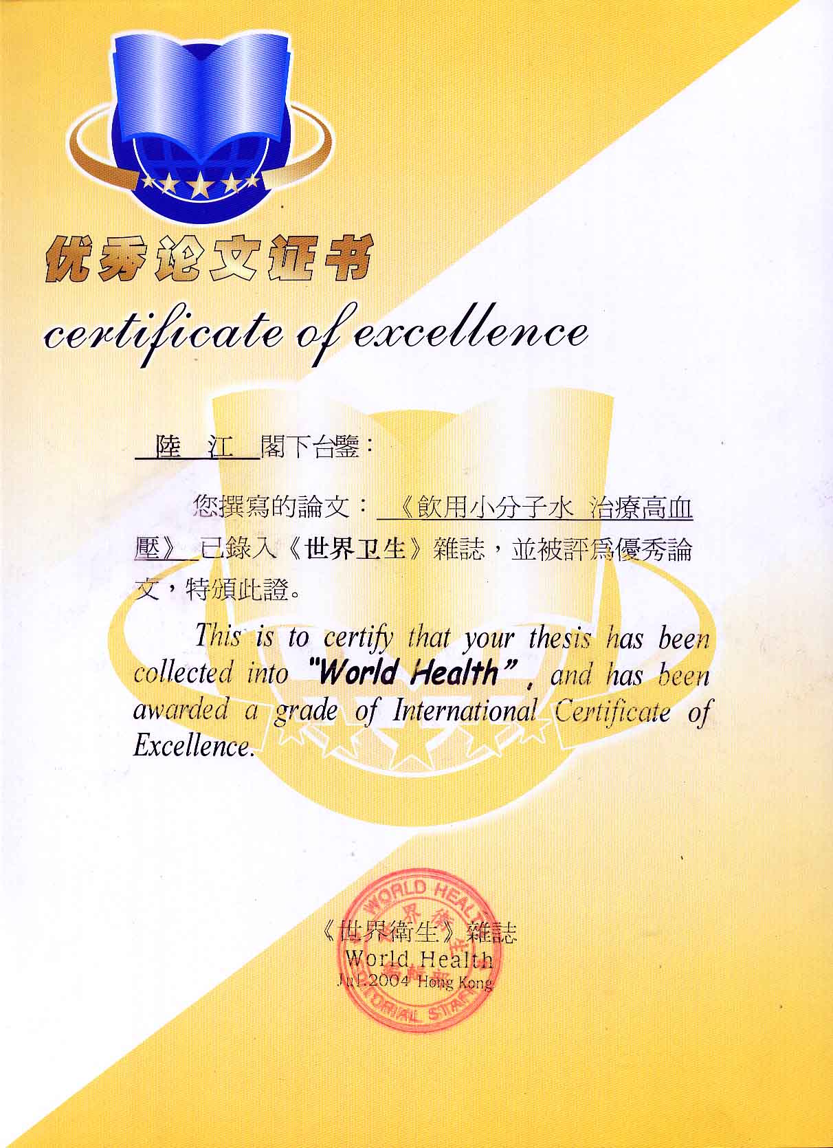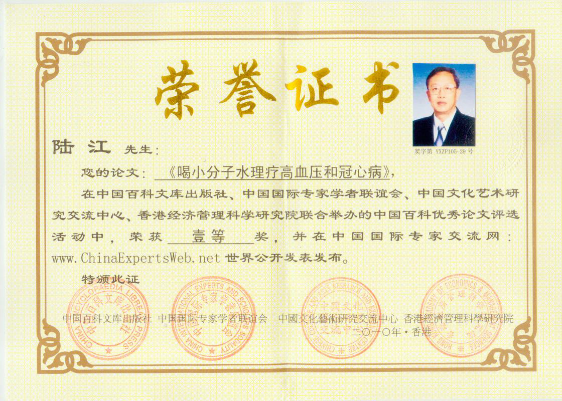 -----我是從事建筑的高工,本來沒有資格去攻克醫(yī)學(xué)難題,卻為了自身健康才扣響醫(yī)學(xué)的大門。由于我1990年患高血壓,因怕中風(fēng)才研究發(fā)明了離子水瓶,我把水處理成微小分子團(tuán)水,飲用后治愈了高血壓。便于1993年底送到三家省級醫(yī)院做臨床試用4個月。經(jīng)北京和廣西醫(yī)學(xué)專家鑒定:"降脂降壓效果好"," 能擴(kuò)大心腦動脈流量,改善心腦電圖以及微循環(huán)","對治療心腦動脈粥樣硬化、高血壓、高血脂有良好的醫(yī)療保健作用。""產(chǎn)品的技術(shù)性能和療效達(dá)到了同類產(chǎn)品的國內(nèi)領(lǐng)先水平,經(jīng)廣西醫(yī)學(xué)科學(xué)情報研究所檢索,未見國外有類似報道。"中國醫(yī)學(xué)科學(xué)院張正國教授從美國國立醫(yī)學(xué)圖書館數(shù)據(jù)庫存Medline檢索英俄文資料,均未見類似報告。2000年上市后,我為了對消費(fèi)者負(fù)責(zé)而繼續(xù)觀察研究,一直通過《信譽(yù)卡》和《質(zhì)量跟蹤調(diào)查書》向患者承諾療效,請用戶使用6個月后反饋效果。和脂壓患者飲用2至5個月內(nèi),消除癥狀,停服藥物,血壓正常;冠心病患者飲用3~5個月逐漸減輕至消除心絞痛、房顫等癥狀,不再服藥,飲用1年左右心電圖正常,經(jīng)冠脈造影掃描無明顯狹窄,表明冠心病痊愈。大量患者還反映許多衰弱器官被修復(fù),讓前列腺增生、慢性咽喉炎、慢性氣管炎、支氣管炎、慢性胃炎、腸炎和膽囊炎等不藥而愈;2型糖尿病患者是因為胰島衰弱致病,飲用該水半年至一年,逐漸減藥至停藥,血糖尿糖正常,真正治愈2型糖尿病。中風(fēng)后遺癥患者飲用六七個月,可逐漸減輕至消除肢體和語言障礙,表明飲用該水能讓壽命很長的神經(jīng)元細(xì)胞逐漸修復(fù),奇跡般地恢復(fù)肢體和語言功能。飲用后還使胸腺和脾臟兩個重要的免疫器官被修復(fù)和增強(qiáng),產(chǎn)生免疫細(xì)胞多,提高了免疫力,使人不生病或少生病。自此, 飲用微小分子團(tuán)水創(chuàng)造了攻克冠心病、高(低)血壓和糖尿病三大醫(yī)學(xué)難題的奇跡。人們對此感到不可思議,但實踐是檢驗真理的唯一標(biāo)準(zhǔn)。